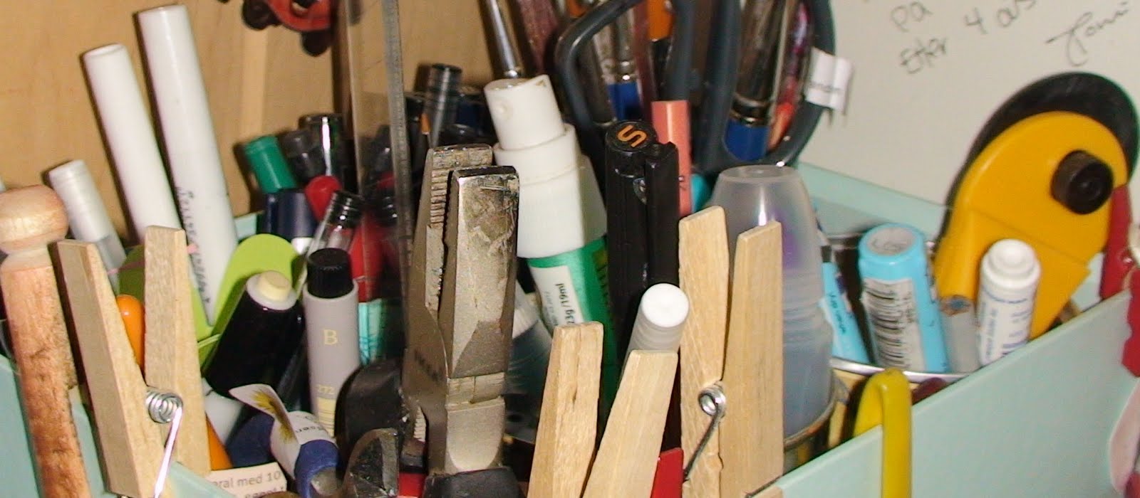 Hyllen med alle småskuffene har jeg en gang i tiden kjøpt på Biltema.Det tok meg en hel dag og sortere alt de som ligger der.Før hadde jeg det i to esker..Det var ikke en god oppevaring.Og jeg fant ikke noe av det jeg trengte.Men nå har hver ting sin plass og alle skuffene er merket.